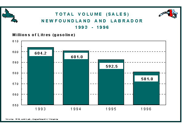 In Newfoundland and Labrador, the decline in the 1980s has continued into the 1990s. The total volume of gasoline sold in the Province has dropped from 604 million litres in 1993 to 581 million litres in 1996(36), a decrease of 3.8%.