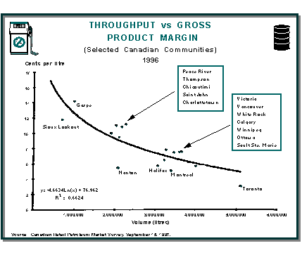 If a station selling regular unleaded gasoline at the current price of 67.9¢ per litre(51) is minimally viable at a throughput of 1.5 million litres yearly, a low volume station (500,000 litres annually), with an equal amount of capital employed in the outlet and generally the same operating costs, would need to sell that same litre of regular unleaded gasoline at approximately 82¢ a litre(52)in order to earn the same return.