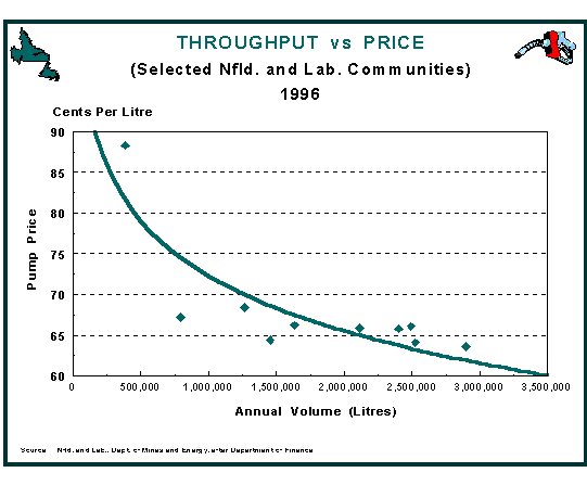 In order to earn a rate of return equal to Newfoundland Power, a modern multi-service, multi-pump gasoline outlet may need to sell in excess of 3.75 million litres of gasoline annually.(49) While achievable for some locations, it is reasonable to conclude that not every site warrants a $2,000,000 investment. Accordingly, some isolated micro-markets in the province will not benefit from the efficiencies achieved through this process . One result will be a perpetuation of the variation in price between urban and rural areas of the Province.