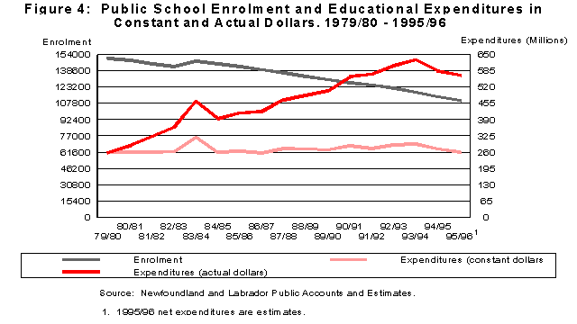 Figure 4 shows total student enrolment compared with educational expenditures in the Province from 1979/80 to 1995/96. Expenditures are expressed in constant dollars using 1979/80 as a base year and adjusted to reflect the consumer price index. Enrolment dropped by approximately 40,000 students over the period while expenditures, in constant dollars, remained relatively stable showing a slight decline over 1979 levels in the most recent fiscal year. In actual dollars, expenditures increased from 258 million in 1979/80 to 567 million in 1995/96.