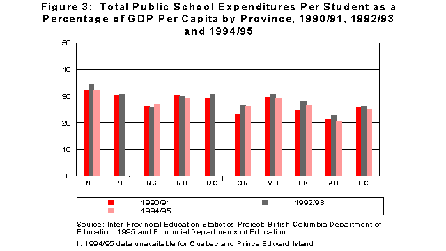 Although the total amount spent per student in this Province is lower than in many other provinces, the percentage of GDP per capita spent on education is highest. This indicates a substantial commitment to education in relation to the Province's ability to pay.