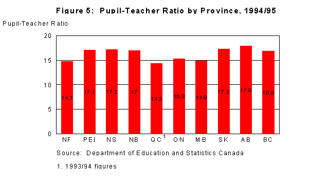 When compared to the other provinces in Canada, our provincial pupil-teacher ratio is one of the lowest in the country. The latest national figures available (1994/95) show that relative to the number of students, Newfoundland and Labrador provides more teachers than any other province except Quebec. This low pupil-teacher ratio reflects Government's overall commitment to education. These extra teachers allow schools to offer a core program to students who must attend small schools.