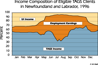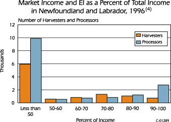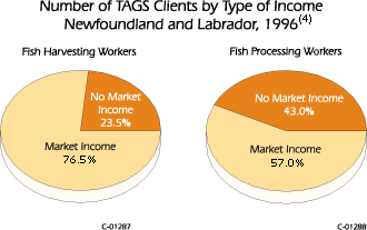 | The situation differs somewhat for TAGS clients classified as processing workers. While statistics relating to the incomes of processing workers are not as detailed as those for harvesting workers, estimates based upon those that are available indicate that most of the income earned by processing workers also comes from work within the industry. A smaller number of these clients (57 percent) had market earnings as compared to harvesters. These data reflect the continued activity in the fisheries since the moratorium (see Section 5.0) and underline the fact that a large number of TAGS clients have been able to maintain attachment to the industry, in spite of the closures of major stocks in 1992. | |||||