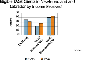 Statistics also reveal that the proportion of workers earning market income has been increasing since 1995. In 1995, about 35 percent of clients relied exclusively on TAGS. This proportion fell during 1996 when about 30 percent of those eligible for benefits relied upon TAGS exclusively. The diagram indicates that increases were seen in the proportion of TAGS clients with TAGS/employment income and TAGS/employment/EI income. These trends are reflective of activity in the industry during the period from 1992 to 1996. The number of people who have demonstrated the capability to continue to find work and to qualify for UI/EI is notable. This is not to say that everyone who has found employment and qualified for UI/EI has been able to obtain the type or the duration of employment most preferred (for example, work in groundfish harvesting and processing). It does indicate, however, that the industry and other labour markets have been able to partially absorb the impact of the fisheries closures. |