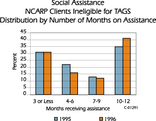 ![]() Of the 3,000, approximately 24 percent were a member of an SA case which received benefits in 1995 and 21 percent in 1996. During 1995 and 1996 about 30 percent of these individuals belonged to a case which received benefits for three months or less and some 70 percent received benefits for less than a year. The diagram shows the distribution of clients by number of months on assistance in 1995 and 1996. It indicates that in 1996 a larger proportion of clients collected benefits for a greater number months than than was the case in 1995. In May 1996, 1,470 individuals who had been eligible for TAGS exhausted their benefits. During the twelve months that followed, the proportion that requested SA was not significantly different from what was observed for those who left the program in 1994. About 23 percent of the individuals were SA recipients during the twelve month period. It remains to be seen whether or not other aspects of their SA attachment will be similar to the 1994 group. Data required to compare the two groups will not be available until the fall of 1997. Most of those who have exited the TAGS program have not accessed SA. Analysis indicates that some of those who have exited TAGS live in households which have other family members eligible for either TAGS or EI or are employed in the labour market. This would have the effect of diminishing the need and/or eligibility for SA. Also, as was described elsewhere, many TAGS clients have had attachment to the labour market both during and since their eligibility for TAGS. These workers have not found it necessary to seek income support from the Province's Social Assistance program to offset the income no longer available from TAGS. Since the nature and characteristics of those who are currently eligible for TAGS may differ from the groups referred to above, it remains to be seen whether or not the statistics accurately foretell what will be experienced by future TAGS exhaustees. |
