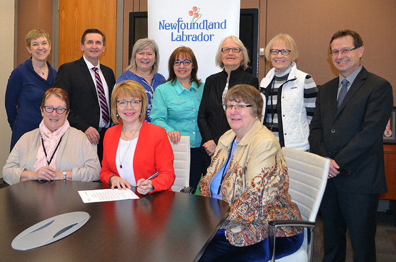 The Honourable Lisa Dempster, Minister of Children, Seniors and Social Development (CSSD), recently met with the Child and Youth Advocate, and representatives of SeniorsNL and the Coalition of Seniors to sign a proclamation marking June 1 as Intergenerational Day and June as Seniors Month. Pictured are (Back L-R) Donna Ballard, Deputy Minister, CSSD; Derek Bennett, Parliamentary Secretary CSSD; Pamela Crummey, Coalition of Seniors; Jackie Lake-Kavanagh, Child and Youth Advocate; Lorraine Best, SeniorsNL; Mary Ennis, SeniorsNL, and Rick Healey, Assistant Deputy Minister, CSSD. (Front L-R) Sharron Callahan, Chair, Coalition of Seniors; Minister Lisa Dempster; Jan Lilly, Board Chair, SeniorsNL.