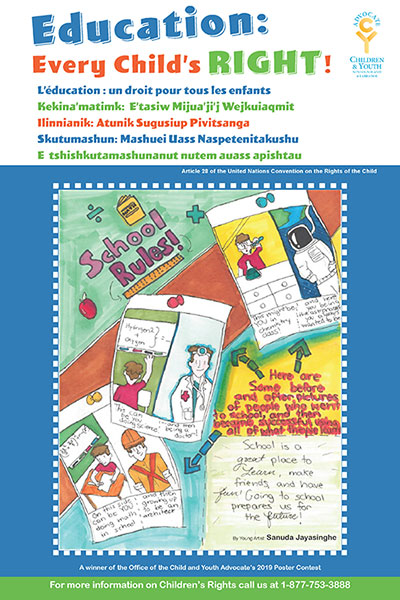 Child and Youth Advocate Jackie Lake Kavanagh is delighted to announce the winners of her office’s poster contest. The contest asked young people in the province to design a poster about what the right to education means to them. The Right to Education is one of many fundamental rights identified in the United Nations Convention on the Rights of the Child (UNCRC).