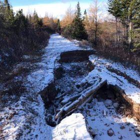 There has been a significant washout in T’Railway Provincial Park, approximately 30-35 kilometres east of Howley (Gaff Topsails area).
