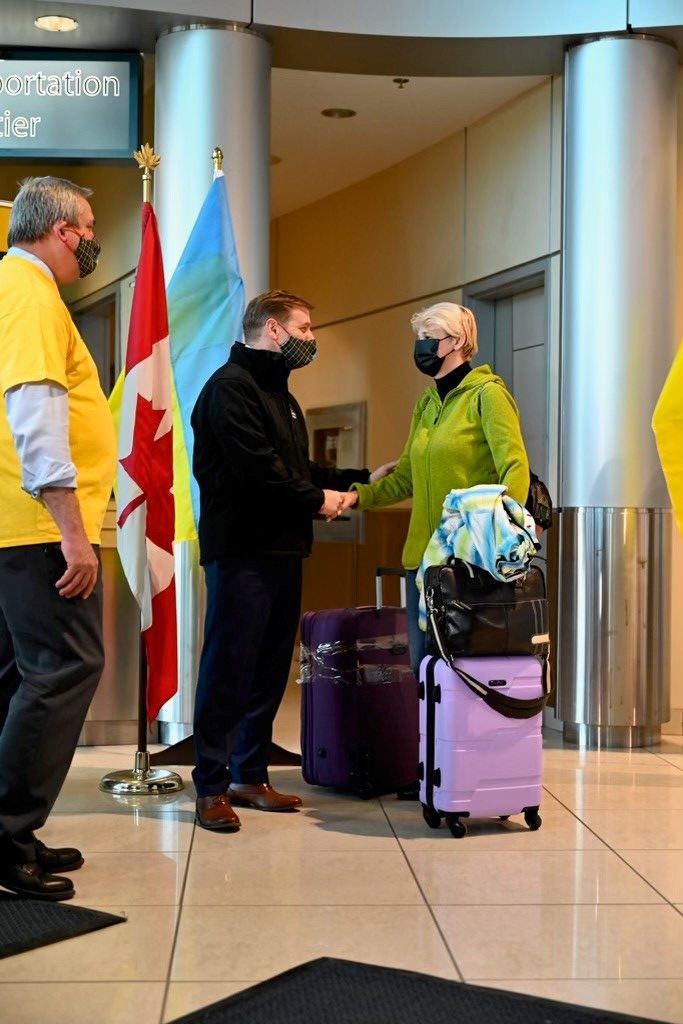 The Honourable Andrew Furey and the Honourable Gerry Byrne meet the first Ukrainian off the airlift at St. John’s Internaional Airport.