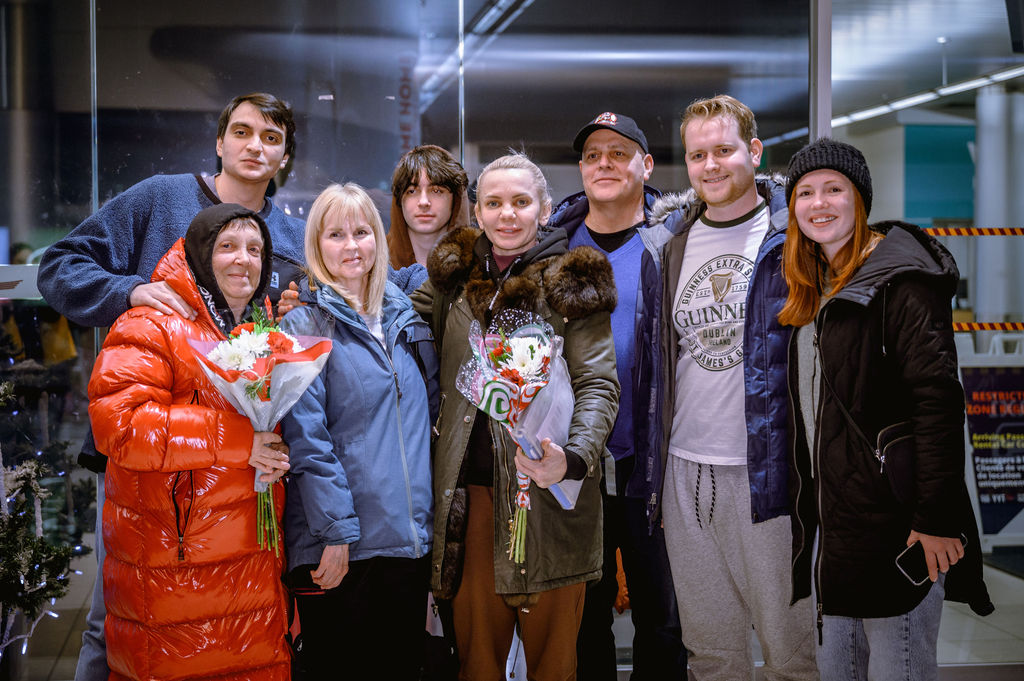 Alper Hos (back left in blue sweater) who arrived on the May 9, 2022 airlift is reunited with his mother Nataliya Hos (centre in brown jacket with fur), his grandmother Oleksandra Bila (left in orange jacket) and his brother Timur Hos (fourth from left in hoodie). They are joined by a local family that has supported Alper since he arrived in Newfoundland and Labrador.