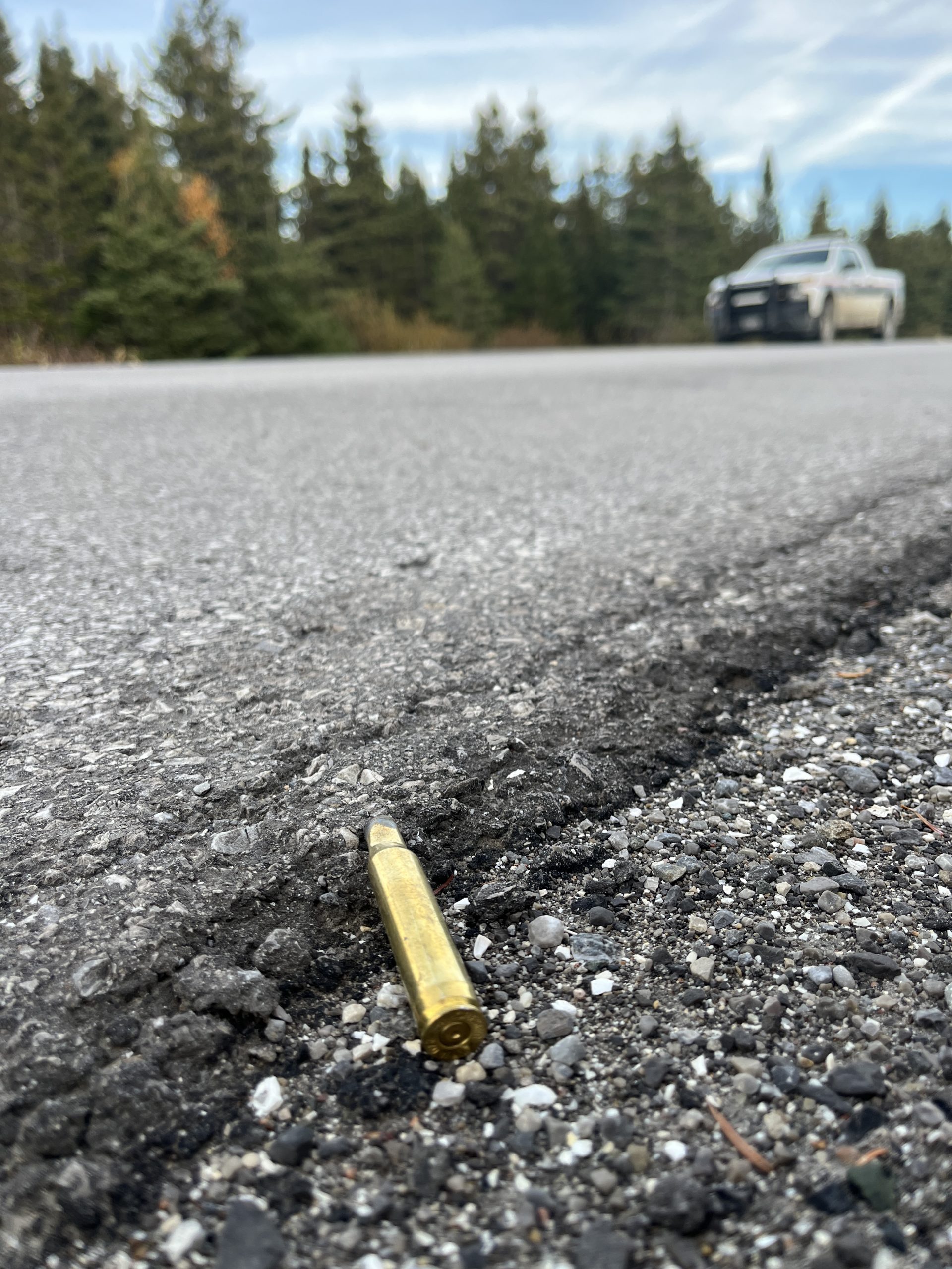 Officers discovered a large blood stain on the road and fresh moose remains adjacent to the road in the ditch. A shell casing from a hunting rifle was located across the road from the kill site.