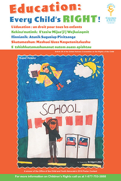 Jackie Lake Kavanagh de l’équipe du Bureau du défenseur des enfants et de la jeunesse est ravie d’annoncer les gagnants du concours d’affiche. Les jeunes de la province étaient invités à concevoir une affiche représentant ce qu’est pour eux le droit à l’éducation. Le droit à l’éducation est l’un des droits fondamentaux énoncés dans la Convention relative aux droits de l’enfant des Nations Unies.